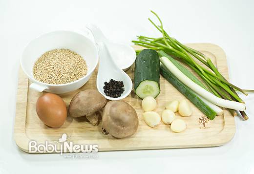 닭 1/2 마리, 통마늘 2개, 후추 1/2큰술, 통흰깨 1컵, 오이 1/3개, 표고버섯 2개, 미나리 3줄기, 대파 1뿌리, 달걀 1개, 물 10컵, 소금, 후추