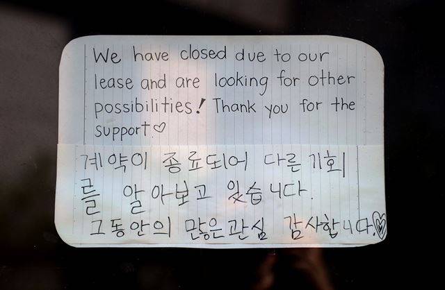 서울 홍대 앞의 한 레스토랑에 한글과 영문으로 쓴 폐업안내문이 붙었다.