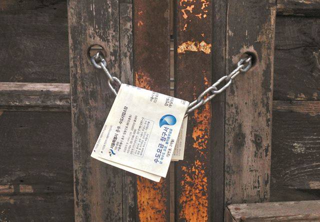 서울 종로구 돈의문 뉴타운 개발지역 내 한 식당 출입문에 밀린 수도요금 청구서가 걸려 있다.