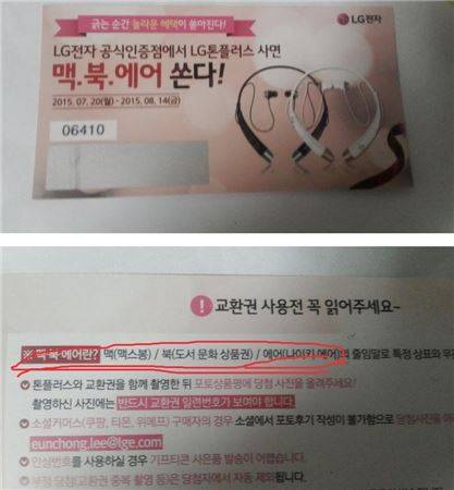 게시물에 포함된 LG전자 교환권에는 "LG전자 공식인증점에서 LG톤플러스 사면 맥.북.에어 쏜다!"고 적혀 있어 눈길을 끈다.