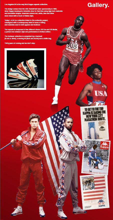 이번에 출시하는 카파의 헤리티지 운동화 LA84는 이탈리아에서 직접 생산하는 스니커즈로 1984년 미국 육상팀 후원을 위해 제작하게 되었으며, LA올림픽 4관왕에 빛나는 칼루이스와 그리피스조이너를 모티브로 디자이너 Giorgetto Giugiaro에 의해 처음 선보였다.