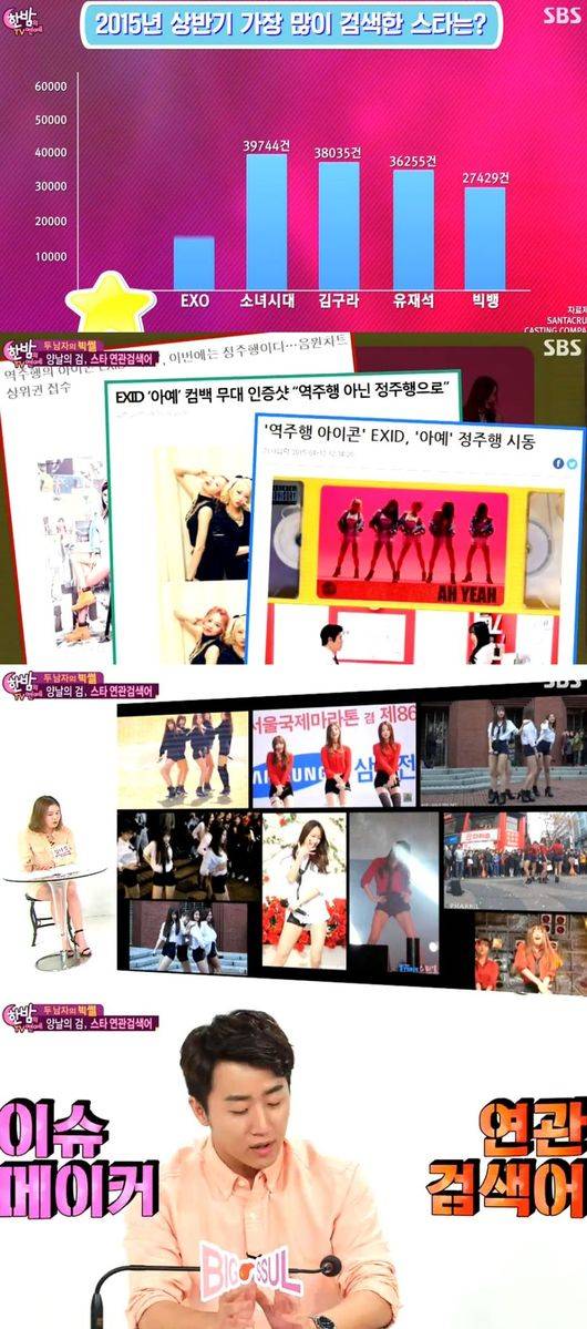 19일 방송된 SBS '한밤의 TV연예'에서는 검색어 분석가 김나경씨가 출연해 연관 검색어에 대한 이야기를 전했다. 김나경씨는 "올해 상반기 가장 많이 검색어된 스타는 EXID였다. 2위는 EXO, 3위는 소녀시대였다. 기사가 가장 많이 난 스타도 EXID다"고 말했다.