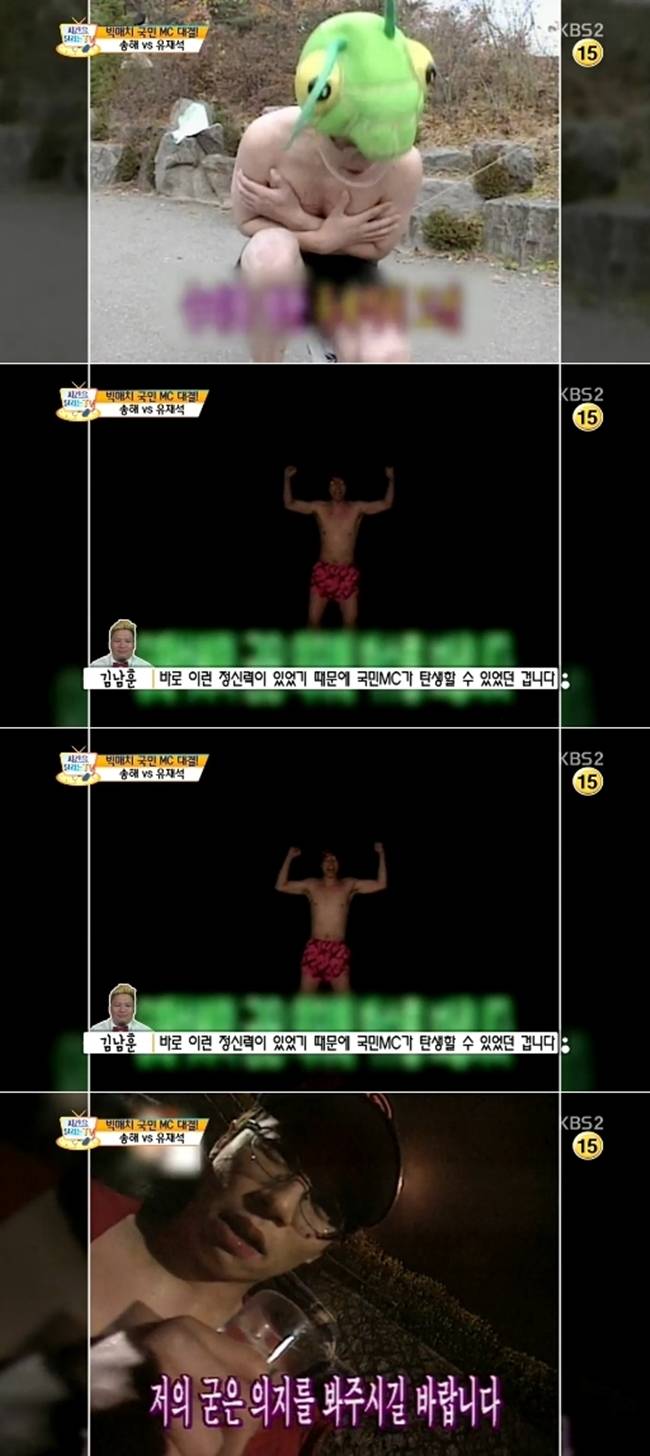 유재석 상반신 탈의 벌칙 모습이 8월20일 방송된 KBS 2TV '시간을 달리는 TV'에서 공개됐다.