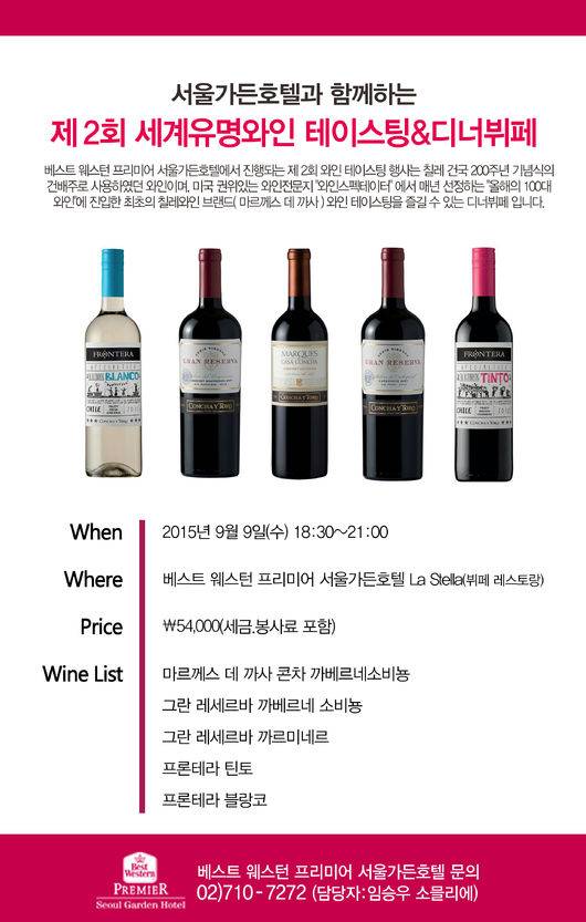 베스트 웨스턴 프리미어 서울가든호텔( www.seoulgarden.co.kr, 이하 서울가든호텔)이 제 2회 세계유명와인 테이스팅&뷔페 행사를 내달 9일 개최한다. 이번 '제 2회 세계유명와인 테이스팅&뷔페'는 지난 7월 7일 선보인 파우스티노 와인을 주제로 한 제 1회 세계유명 와인 테이스팅&뷔페 행사 후 서울가든호텔 1F 뷔페 레스토랑'라스텔라'에서 갖는 두번째 행사다.