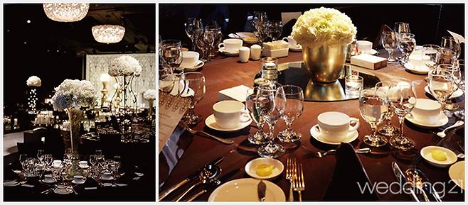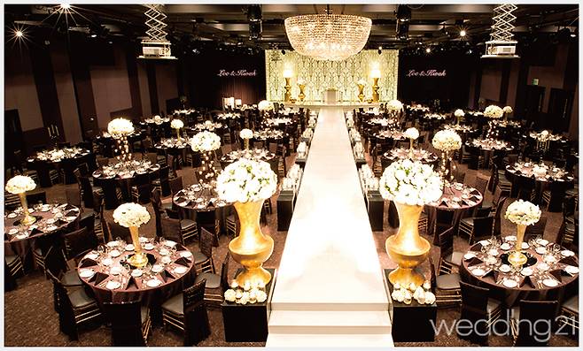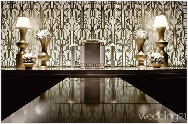 바로 이 공간에서 탁 트인 무대를 배경으로 아르데코 스타일 웨딩의 진수를 담아낸다. 이를 위해 1920년대 유럽을 풍미했던 아르데코 스타일을 모티프로 웨딩홀을 꾸몄는데, 단순하면서도 화려한 형태 표현을 위해 블랙과 골드 같은 강렬하고 고급스러운 컬러를 선택했으며, 화려한 샹들리에로 우아한 분위기를 완성했다.