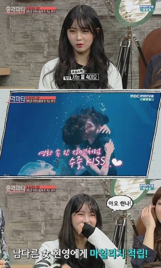 조현영은 이날 각자의 로망이 담긴 키스 방법을 이야기하던 중 "전 물 속에서 키스를 하고 싶다"며 "수영장이나 바닷가에서 하고 싶다"고 말했다.