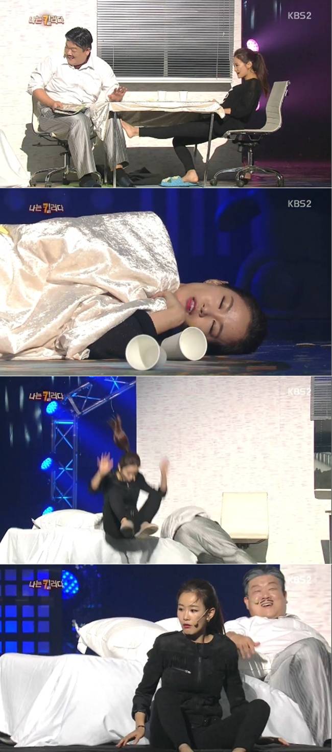 그러자 유민상은 신난 듯 침대에 누웠고 김지민은 그대로 튕겨나가 바닥에 떨어져 폭소를 유발했다.(사진=KBS 2TV '개그콘서트' 방송 캡처)