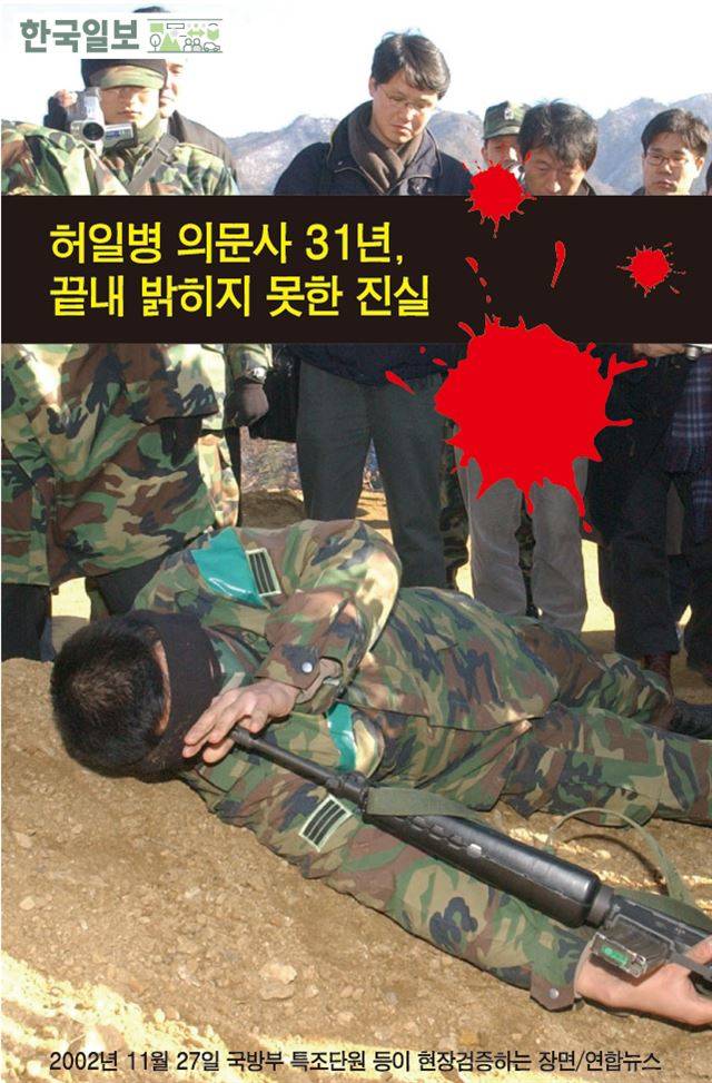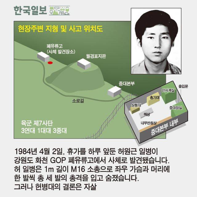 허원근 일병 사건은 2002년 8월 세상 속으로 나왔습니다. 그가 사망한 지 18년. 상사의 총격으로 사망했으나, 군 내부의 조직적인 은폐로 자살로 둔갑했다는 의문사진상규명위원회의 전격적인 발표가 있었기 때문이죠. 전두환 정권에서의 수많은 군 사망 사건 중 하나일 뿐이었던 허 일병 사건이 군 의문사의 아이콘이 된 순간이었습니다.