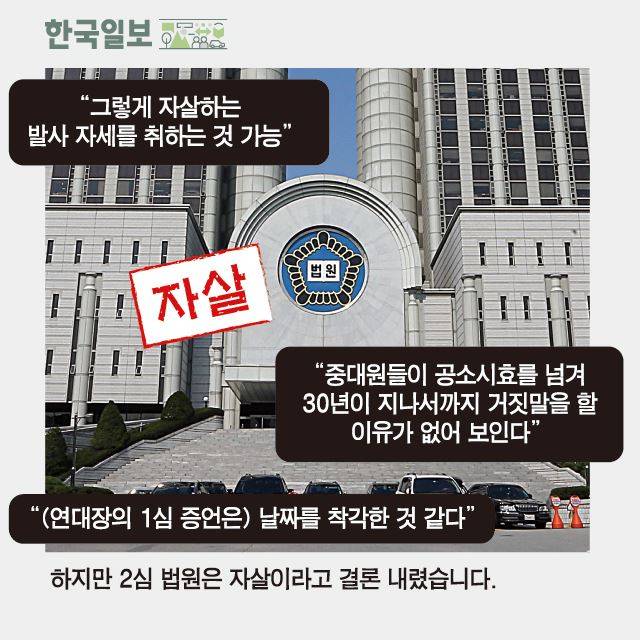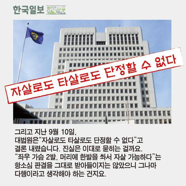 지난 10일 대법원(주심 이상훈 대법관)은 허일병 사건의 사망 원인이 자살인지 타살인지 알 수 없다며 결론을 내리지 않았습니다. 결국 31년 전 양쪽 가슴과 머리에 소총 세 발을 맞고 숨진 채 발견된 허일병의 사인이 결국 밝혀지지 않은 채 묻히게 됐습니다. 허일병 사인의 진실을 밝히려는 유족들의 노력도 결국 원점으로 되돌아갔습니다.
