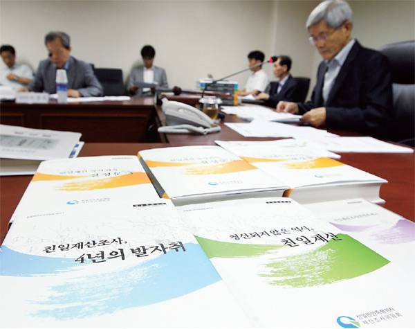 ↑2010년 7월1일 친일반민족행위자재산조사위원회 회의실에서 김창국 위원장(맨 오른쪽)이 참석한 가운데 마지막 전원위원회가 열렸다. © 연합뉴스