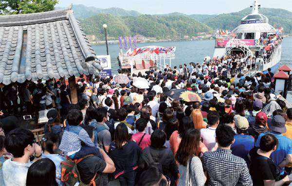 ↑수많은 관광객이 강원 춘천시의 대표 관광지인 남이섬을 오가는 배를 타기 위해 줄지어 서 있다. © 연합뉴스