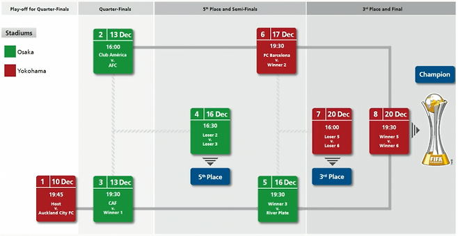 클럽 월드컵은 남미 축구연맹, 유렵 축구연맹, 북중미카리브 축구연맹, 아시아 축구연맹, 아프리카 축구연맹, 오세아니아 축구연맹, 개최국인 일본 J리그 우승팀으로 총 7팀이 결선 토너먼트 방식으로 우승을 가린다.
