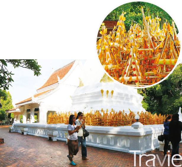 Stupa프라 탓 스리 송 락Phra That Sri song Rak1560년대 태국의 아유타야 왕국과 라오스 비엔티안 지방의 스리 사타나카나헛 왕국이 평화 협정을 맺고 만들었다는 사리탑이다. 사리탑은 신발을 벗고 입장할 수 있는데, 한낮에는 바닥이 뜨거우니 양말을 꼭 준비하는 것이 좋다. 일반적으로 탑돌이를 할 때는 시계 방향으로 돌지만, 이곳에서는 시계 반대 방향으로 돈다. 몸의 왼쪽에 있는 심장을 사리탑과 더 가깝게 두기 위해서다. 큰 수트파 사방으로는 마을 사람들이 만든 대나무 공예품들이 쌓여 있다. 그것이 이곳 마을 사람들이 스투파를 사랑하는 방식이다.