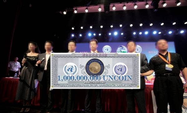 ↑유엔코인재단 대표 이 아무개씨가 지난 8월 주요 판매자 수십 명을 데리고 중국으로 건너가 유엔 측에 유엔코인 10억 개를 기부하는 퍼포먼스를 벌이고 있다. © 유엔코인 홈페이지