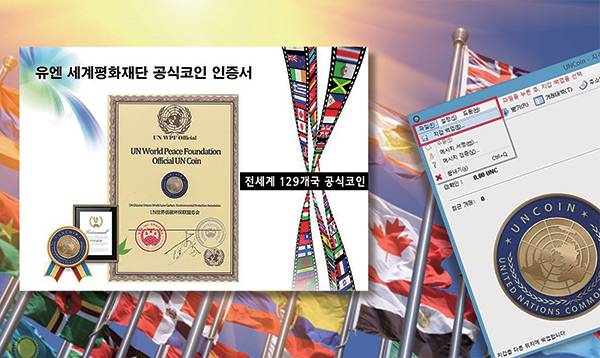 ↑유엔코인이 유엔세계평화재단으로부터 공식 코인으로 인증받았다고 주장하며 홈페이지에 공개한 인증서와 유엔코인 전자지갑(오른쪽). 유엔세계평화재단은 유엔과 전혀 무관한 단체다. © 유엔코인 홈페이지