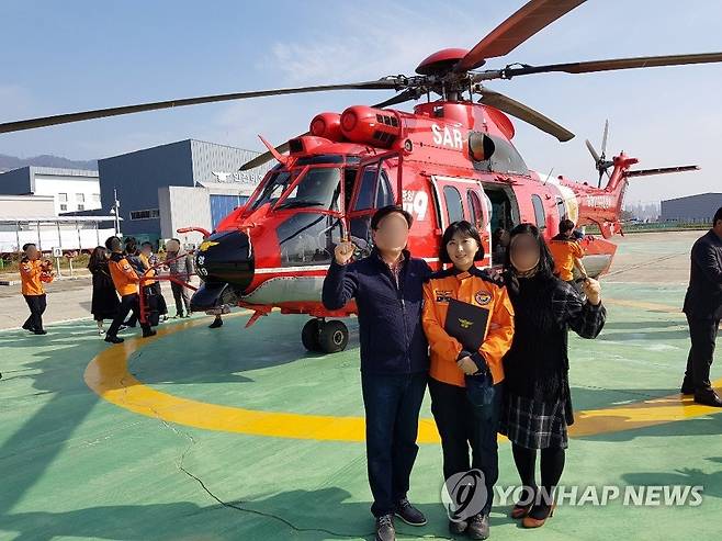 (대구=연합뉴스) 독도 소방헬기 추락 사고로 숨진 중앙119구조본부 영남119특수구조대 소속 박단비 구급대원이 생전 소방헬기 앞에서 부모님과 사진 촬영을 하고 있다. 박 대원 시신은 사고 13일째인 12일 수습됐다. 2019.11.12 [박단비 구급대원 가족 제공, 재판매 및 DB 금지]