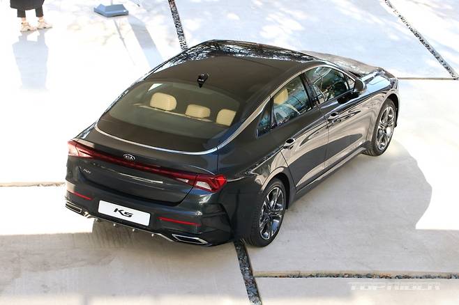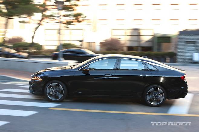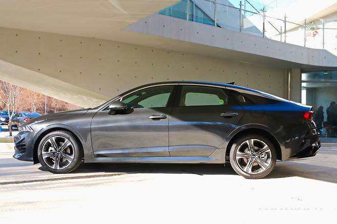 범퍼 하단은 2세대 K5 모델과 마찬가지로 앞으로 길게 뻗어있다. 공격적인 이미지를 구현하는 긍정적인 효과가 있지만, 하부에 손상이 가지 않도록 주의가 필요할 것으로 보인다. 측면은 길고 낮아진 차체에 패스트백 스타일을 적용해 시각적인 만족감을 높였다.