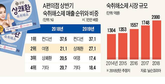 상쾌환이 약진하면서 숙취해소 관련 시장은 제약회사와 주류회사, 유통업체까지 뛰어드는 격전지가 됐다. 젤리 형태로 씹어 삼키는 레디큐 젤리(한독약품), 캔디 형태로 새콤달콤한 요구르트향이 나는 CU의 ‘지금부터 안티이불킥’, 이마트24의 자체상표(PB) 제품 ‘속풀라면’과 아이스크림 ‘견뎌바’ 등이 나왔다.