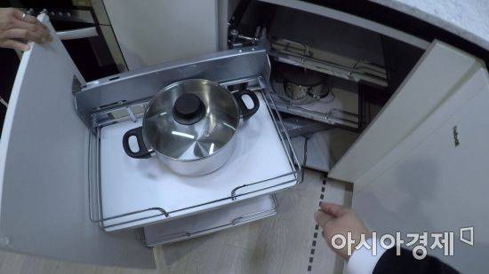 집 내부에서도 다양한 꼼꼼함이 돋보였는데요. 현관에는 미끄러질 수 있는 폴리싱타일이 아닌 반유광타일로 미끄럼 방지를 적용했습니다. 또 수납 면에서도 접이식 신발 수납 공간과 대형 수납장등 다양한 수납 설비를 현관부터 갖춰놓았습니다. 주방에도 곳곳에 수납공간이 다양하게 숨어있습니다. 인출망장을 크게 만드는가 하면 접이식 레일이 설치된 '풀 인출코너장', 와이드 서랍장 등이 적용됐습니다. 이외에도 음식물쓰레기를 바로 버릴 수 있는 설비도 설치될 계획입니다. 거실에도 무선청소기 등 다양한 청소도구를 넣을 수 있는 수납장도 마련됐습니다.