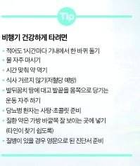 비행기 안에서 소화불량에 걸리지 않도록 예방에 주의해야 한다. 비행기를 타는 날은 바쁘더라도 원래 먹던 시간에 맞춰 식사하고 부드럽고 소화가 잘되는 음식 위주로 먹는다. 1시간마다 걷고 물을 자주 마시는 것이 소화 장애를 막는 데도 도움된다.