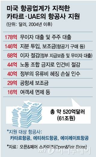 ◇중동의 '비정상'적 보조금 61조...항공업계 판도 변화=21일 미국 오픈&페어 스카이즈에 따르면 카타르와 UAE 정부가 2004년부터 카타르·에티하드·에미레이트 항공 등에 비정상적으로 지원한 금액은 약 520억달러(61조원)에 달한다. 오픈&페어 스카이즈는 미국의 델타·아메리칸·유나티드 항공가 모인 단체다.