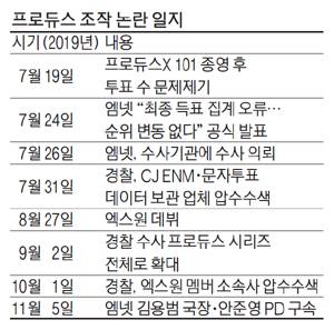 프듀X는 지난 7월 생방송 파이널 무대 이후 연습생 득표수가 특정 숫자 배열의 반복으로 이뤄졌다는 의혹이 제기됐다. 1위부터 20위까지 득표수가 모두 특정 숫자의 배수로 설명된다는 분석이 나오면서 의혹이 확산했다. 논란이 커지자 엠넷 측은 경찰에 수사를 의뢰했다. 시청자들 역시 진상규명위원회를 꾸려 제작진을 사기 혐의로 고소하고, 위계에 의한 업무방해 혐의로 고발했다. 경찰은 해당 프로그램 제작진인 안준영 PD와 김용범 CP 등 2명을 지난 5일 구속했다. 안 PD는 경찰 조사에서 올해 방영한 프듀X(시즌4)와 지난해 방송한 프듀48(시즌3) 등 두 시즌에 걸쳐 순위 조작이 있었음을 인정한 것으로 알려졌다. 경찰은 추가 압수수색 결과를 바탕으로 '아이돌학교' 등 다른 오디션 프로그램에서도 순위 조작이 있었는지 살펴볼 계획이다. 경찰은 김 CP와 안 PD의 구속 기간 만료 시점이 다가옴에 따라 이들을 14일께 검찰에 송치할 계획이다. 이번 조작 논란으로 엠넷이 쌓아온 '서바이벌 왕국'의 명성에도 금이 갔다. 엠넷은 2009년 '슈퍼스타K'를 시작으로 '쇼미더머니' '프로듀스 101' 시리즈를 잇달아 성공시키면서 흥행 가도를 달려왔다. 하지만 가장 히트작으로 꼽히는 프듀 시리즈가 조작 의혹으로 얼룩지면서 신뢰성에 큰 타격을 받았다.