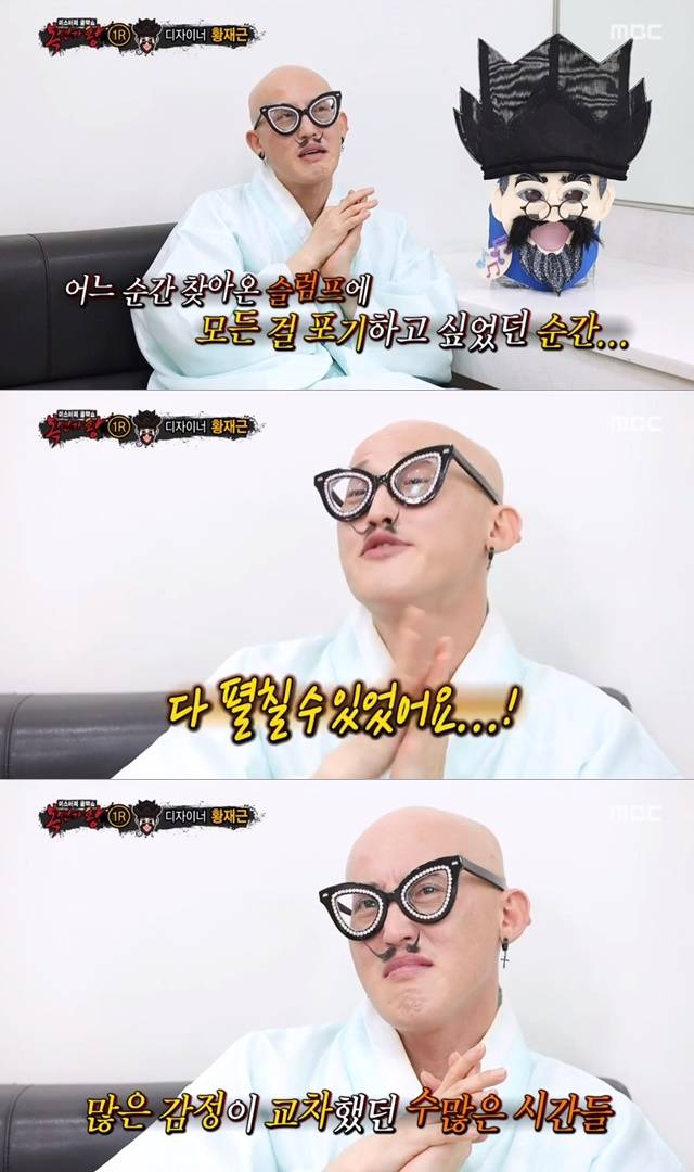 황재근은 "'복면가왕' 가면을 제작하기 전 나는 스스로 못난이라고 생각했다. 옷으로 펼칠 수 없었던 꿈을 가면으로 4년째 펼칠 수 있어서 감사하다. 다른 분들도 나를 보며 용기를 얻으면 좋겠다"고 그간의 소회를 밝혔다.