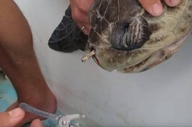 인간의 물건인 플라스틱 빨대가 어떤 경로로 거북이 코에 박혔는지는 알 수 없다.