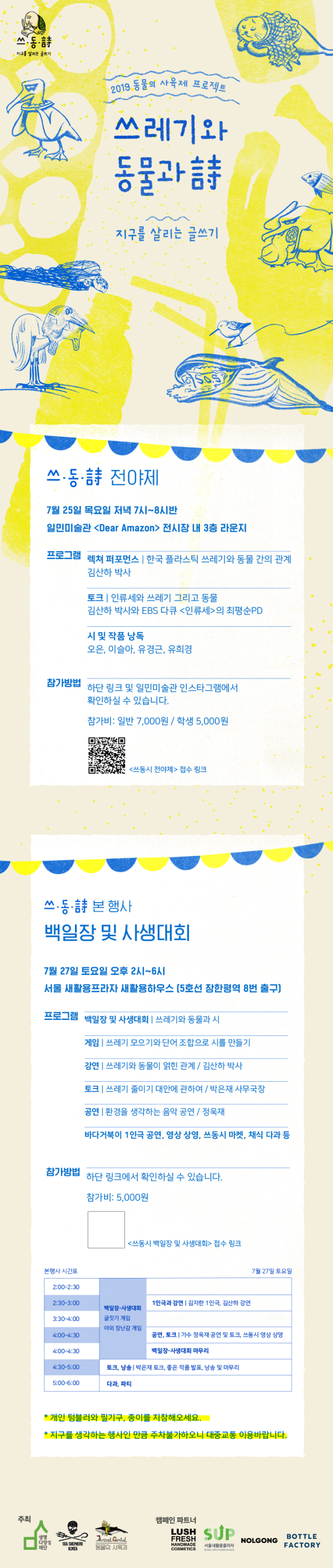 이에 시민들이 나섰다. 생명다양성재단, 시세퍼드 코리아, 동물의 사육제는 7월 한 달간 '쓰레기와 동물과 시'(이하 '쓰동시') 프로젝트를 온·오프라인에서 동시에 진행한다. 서울새활용플라자, 놀공발전소, 러쉬, 보틀팩토리 또한 캠페인 파트너로 함께한다.