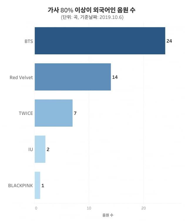 외국어 가사가 전체 가사의 80% 이상을 차지하는 음원 수는 방탄소년단 24곡, 레드벨벳 14곡, 트와이스 7곡, 아이유 2곡, 블랙핑크 1곡입니다. 멜론에 등록된 음원 기준입니다.
