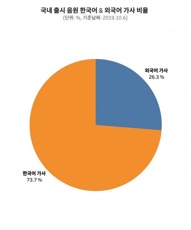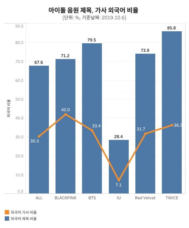 방탄소년단, 블랙핑크, 트와이스, 레드벨벳, 아이유 등 다섯 아이돌팀 및 가수 가사를 모두 종합했을 때 외국어 비중은 26.3%. 바꿔 말하면 나머지 73.7% 가사는 한글인 셈입니다.