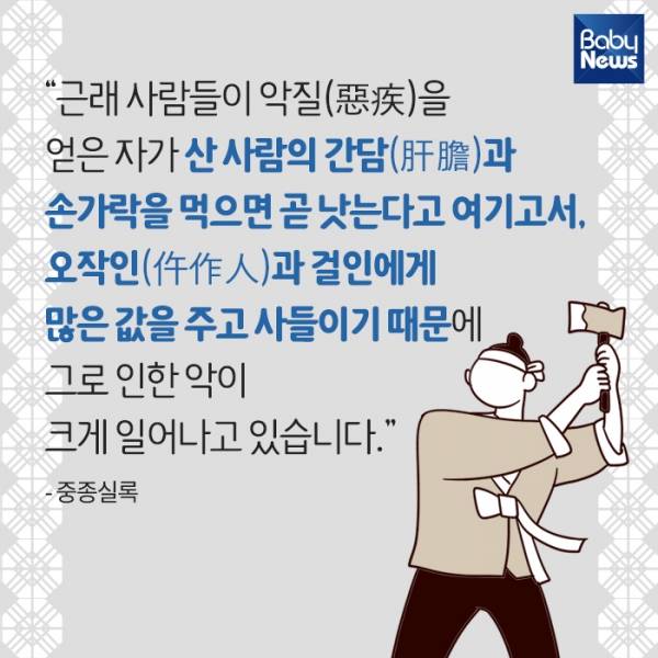 7. "근래 사람들이 악질(惡疾)을 얻은 자가 산 사람의 간담(肝膽)과 손가락을 먹으면 곧 낫는다고 여기고서, 오작인(仵作人)과 걸인에게 많은 값을 주고 사들이기 때문에 그로 인한 악이 크게 일어나고 있습니다." - 중종실록