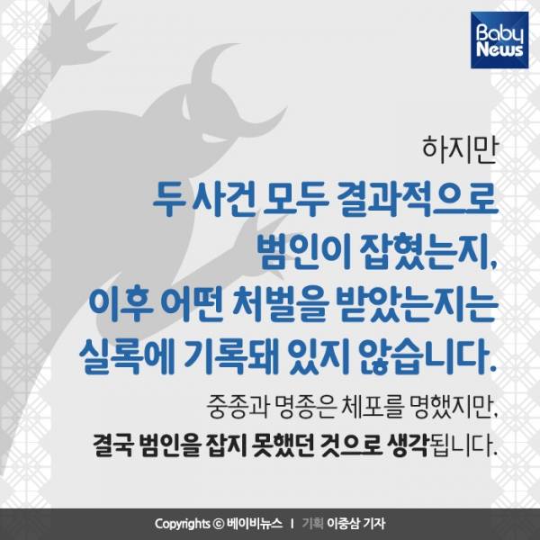 12. 하지만 두 사건 모두 결과적으로 범인이 잡혔는지, 이후 어떤 처벌을 받았는지는 실록에 기록돼 있지 않습니다. 중종과 명종은 체포를 명했지만, 결국 범인을 잡지 못했던 것으로 생각됩니다.