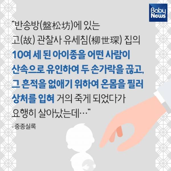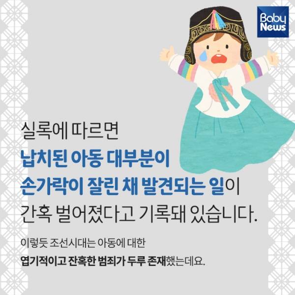 3. 실록에 따르면 납치된 아동 대부분이 손가락이 잘린 채 발견되는 일이 간혹 벌어졌다고 기록돼 있습니다. 이렇듯 조선시대는 아동에 대한 엽기적이고 잔혹한 범죄가 두루 존재했는데요.
