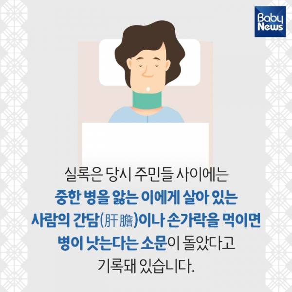 6. 실록은 당시 주민들 사이에는 중한 병을 앓는 이에게 살아 있는 사람의 간담(肝膽)이나 손가락을 먹이면 병이 낫는다는 소문이 돌았다고 기록돼 있습니다.