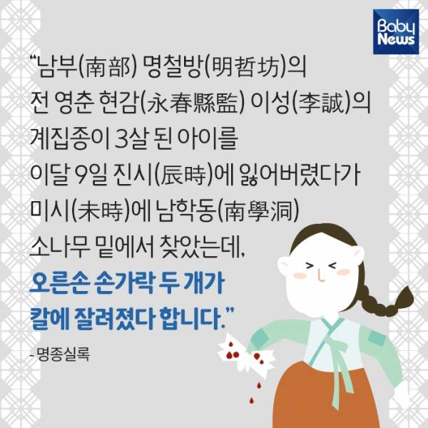 교과서에 있는 딱딱한 역사 이야기가 아닙니다. 역사책에서는 결코 배울 수 없는 역사 속 숨겨진 육아 이야기를 재미있게 전하는 카드뉴스 '역사 속 육아 이야기' 시리즈. 여섯 번째 이야기는 '미제로 남은 조선시대 아동 손가락 절단 사건' 이야기입니다.