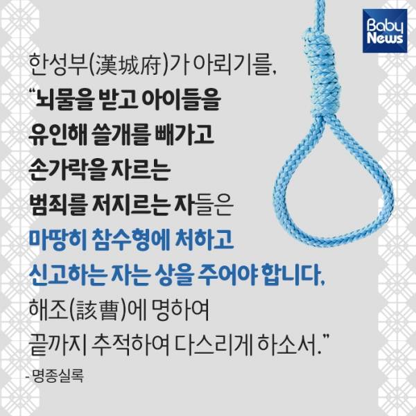 11. 한성부(漢城府)가 아뢰기를, "뇌물을 받고 아이들을 유인해 쓸개를 빼가고 손가락을 자르는 범죄를 저지르는 자들은 마땅히 참수형에 처하고 신고하는 자는 상을 주어야 합니다, 해조(該曹)에 명하여 끝까지 추적하여 다스리게 하소서." - 명종실록