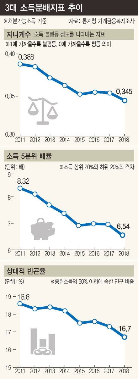 지난해 소득 분배 상황을 나타내는 세 가지 지표(지니계수, 소득 5분위 배율, 상대적 빈곤율)가 모두 개선세로 돌아섰다. 경기 부진 속에서 정부가 적극적인 분배정책으로 저소득층 소득을 뒷받침했기 때문으로 풀이된다. 다만 자영업 불황 등으로 고소득층의 사업소득 증가가 둔화한 영향도 작용했다.