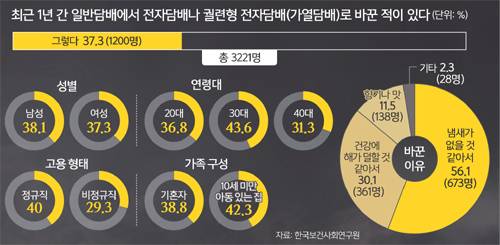 지난 5월26일 한국보건사회연구원이 발표한 ‘담배 규제 및 체계적 관리에 관한 정책 연구’ 보고서에 따르면 지난해 11월 진행된 온라인 인식조사 결과 흡연자 3221명의 37.3%(1200명)가 ‘최근 1년간 일반담배에서 전자담배로 바꾼 적이 있다’고 답했다.