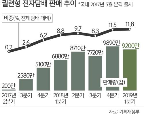 5일 기획재정부의 ‘2019년도 1분기 담배 시장 동향’ 자료에 따르면 1분기 궐련형 전자담배 판매량은 9200만갑으로 전년 동기의 6880만갑보다 33.6% 증가했다. 2017년 전체 담배 판매량의 2.2%이던 전자담배의 시장점유율은 지난해 9.6%, 올 1분기 11.8%까지 치솟았다.