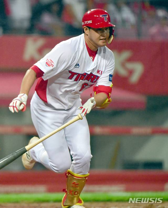【광주=뉴시스】류형근 기자 = 27일 오후 광주 북구 광주-기아챔피언스필드에서 열린 2019프로야구 KIA 타이거즈 대 삼성 라이온스의 경기, 9회말 무사에서 KIA 대타 고장혁이 타격을 하고 있다. 2019.08.27.