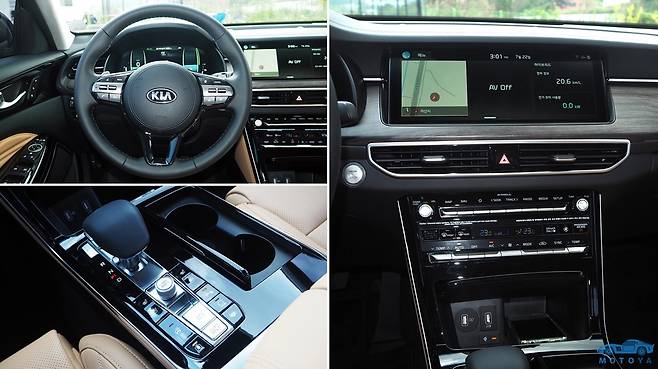 인테리어 또한 대대적으로 손을 봤다. 인테리어 디자인에서 가장 큰 비중을 차지하는 대시보드와 플로어 콘솔을 통째로 바꿨다. 기존 K7과 공유하고 있는 부분은 스티어링 휠 밖에 없을 정도다. 새로운 대시보드는 수평 기조를 크게 강조한 구성과 더불어 전반적으로 더욱 깔끔하고 고급스러워졌다. 플로어 콘솔 또한 변화한 대시보드에 맞게 일신되었으며 자잘한 버튼은 물론, 변속 레버까지 전자식으로 바꿨다. 변속 레버의 작동법은 제네시스 계열의 차종과 동일하며, 그 뒤편으로 주행모드 다이얼이 설치되어 있다. 12.3인치 터치스크린 디스플레이는 높은 해상도와 더불어 우수한 사용 편의성을 제공한다. 풀LCD 계기반은 감응속도가 빠르고 주행모드별로 서로 다른 테마를 제공한다. 애니메이션의 동작도 빠르게 이루어지며, 지연이 거의 없다. 전체적으로 현대 8세대 쏘나타의 것과 유사한, 단순한 디자인의 인터페이스 덕분에 시인성도 만족스럽다.