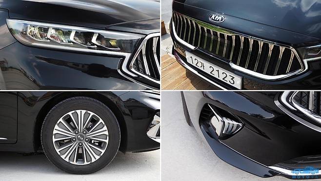 기아 K7은 K7 프리미어로 거듭나면서 외관에서부터 많은 부분이 변화되었다. 특히 얼굴의 경우에는 그야말로 대격변을 거쳤다. 기존의 K7에 비해 한층 험상궂은 인상이기는 하지만 기존 K7에 비해 디자인의 완성도가 크게 올라간 느낌이 든다. 데뷔 초기부터 K7의 큰 특징으로 꼽혔던 인탈리오 그릴은 사이즈가 한층 커졌고 안쪽으로 음푹 들어가는 형상도 더욱 강조되어 더욱 화려해졌을 뿐만 아니라, 헤드램프 하단을 향해 튀어나오는 디테일을 없애 더 깔끔해졌다. Z자 주간상시등을 내장한 헤드램프의 형상도 크게 변화하여 더욱 감각적인 모습으로 거듭났다. 범퍼 하단에도 범퍼를 전체적으로 가로지르는 크롬 장식을 추가하여 더 화려해졌다.