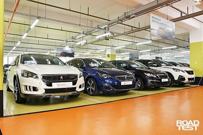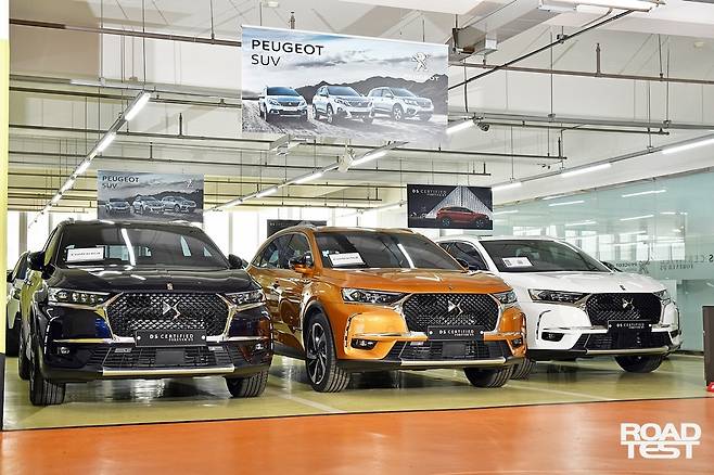 한불모터스의 인증중고차 전시장은 지하철 5호선 장한평역 6번 출구에서 도보로 5분 거리인 카서울닷컴 건물 9층에 자리한다. 방문해 보니 푸조와 시트로엥, DS의 인증중고차가 천장에 매단 브랜드별 광고판 아래 줄을 맞춰 서 있었다. 차령이 어리고 컨디션이 좋은 차 위주로 매입하다 보니, 언뜻 봐선 신차 전시장이라고 해도 믿을 만큼 상큼한 상태였다.