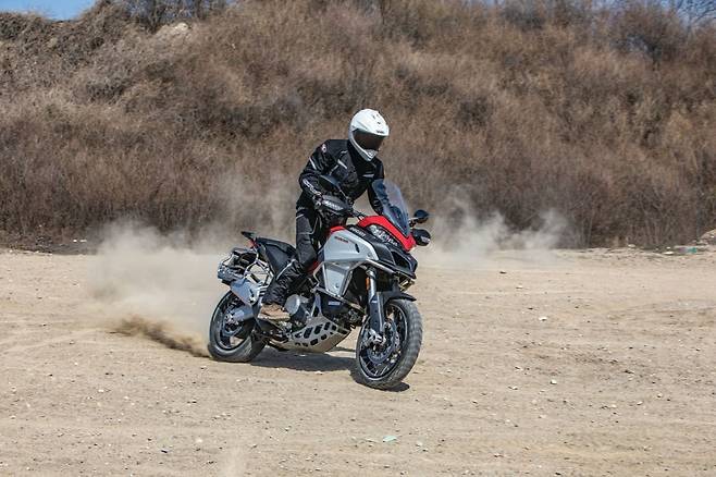 엔듀로라는 타이틀을 지닌 만큼 오프로드에서 집중적으로 테스트를 진행했다. 오프로드를 달리기 전 타이어 공기압을 조절하고 엔듀로 모드에 각종 전자 장치를 설정했다. 오프로드에서는 최대출력으로 설정할 필요가 없다. 1260 엔듀로의 강한 토크는 타이어가 금방 한계에 도달하게 하여 선회 동작은 물론이고 부드러운 주행이 어렵게 만들기 때문이다. 하지만 출력을 강하게 설정하고 싶다면 트랙션 컨트롤의 개입을 설정하여 쉽게 변경할 수 있다. 노면 상황이나 라이더의 실력에 따라서 원하는 대로 설정할 수 있다는 점이 큰 강점이다.