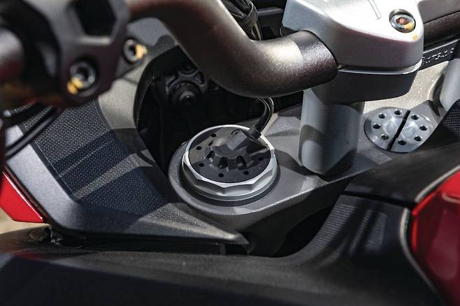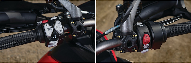 그다음 전자적인 세팅에서 또 놀랐다. 슈퍼스포츠 바이크를 만드는 회사답게 출력을 넓고 세밀하게 세팅할 수 있다. 핸들 왼쪽 스위치 뭉치에 있는 버튼을 이용하여 주행모드를 설정할 수 있고 그 안에 들어가서 엔진의 출력부터 ABS, DTC, DWC, DQS 등을 끄고 켜거나 조절할 수 있다. 모든 내용이 풀 컬러 TFT 디스플레이에 표시되는데 예를 들어서 브레이크 시스템을 설정할 때는 화면에 바이크가 표시되고 개입 단계를 조절함에 따라서 리어 휠과 프런트 휠에 제어가 어느 정도 개입하게 되는지 화면으로 알 수 있도록 표출된다. 버튼 조작하는 법도 직관적이라 쉽게 익힐 수 있다.