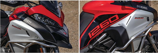 사자의 찡그린 콧잔등을 연상시키는 비크 디자인은 야수성을 잘 드러낸 디테일이다. 여기에 차량 중앙에 거대하게 자리 잡은 30리터의 대용량 연료탱크가 멀티스트라다 엔듀로만의 존재감을 만든다. 1200 엔듀로와 비교해 디자인의 큰 변화는 없기 때문인지 탱크의 데칼에 기존의 ENDURO라고 쓰인 자리에 1260을 새겨놨다. 오프로드 주행에 미끄러지지 않도록 설계된 풋패그는 오프로드 바이크의 것과 흡사하다. 리어 브레이크 레버도 마찰력이 좋도록 디자인되어 있고 높이를 쉽게 조절할 수 있도록 설계되어 있다. 배기 머플러는 납작한 형태로 디자인되어 넘어지더라도 쉽게 파손되지 않도록 디자인되었다. 후면으로 돌아가니 LED 테일 램프도 공격적인 뒤태를 만든다.