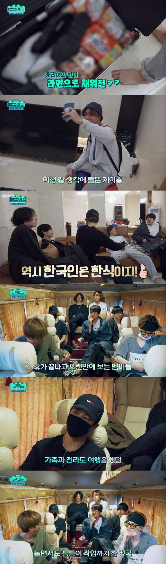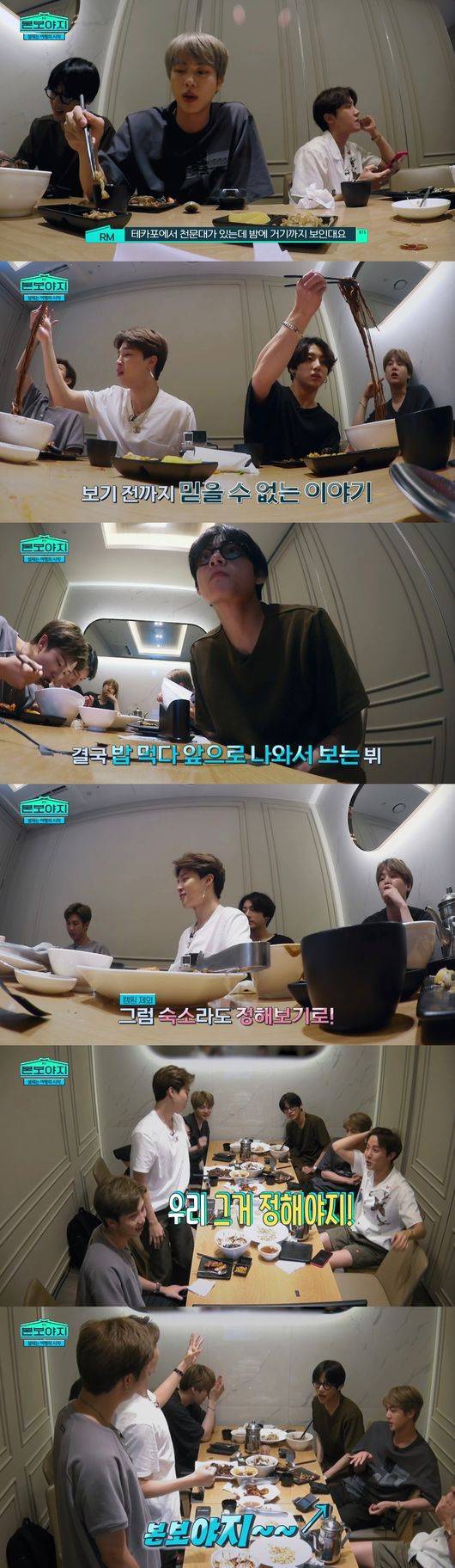 여행 당일이 다가왔다. 한 달간 휴가를 마치고 숙소에 모인 방탄소년단은 이미 짐을 다 싸둔 상태였다. 특히 뷔는 캐리어 반 이상을 라면으로 채웠다. 뷔는 "이번에 멤버들이 캠핑할 때는 라면이 꼭 있어야 될 것 같아서 제가 챙겼다"며 뿌듯해했다.