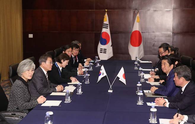 문재인 대통령과 아베 일본 총리가 24일(현지시간) 중국 쓰촨성 청두 세기성 샹그릴라호텔에서 한일 정상회담을 진행하고 있다.