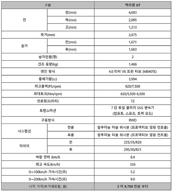 맥라렌 GT는 7단 듀얼 클러치 SSG 자동변속기가 적용돼 최고 속도 326km/h, 정지 상태에서 100km/h까지 3.2초, 200km/h까지는 9.0초면 도달한다. 그랜드 투어러 고객이 선호하는 부드럽지만 정교한 드라이빙 성능을 구현하기 위한 최적화 프로세스도 병행했다.